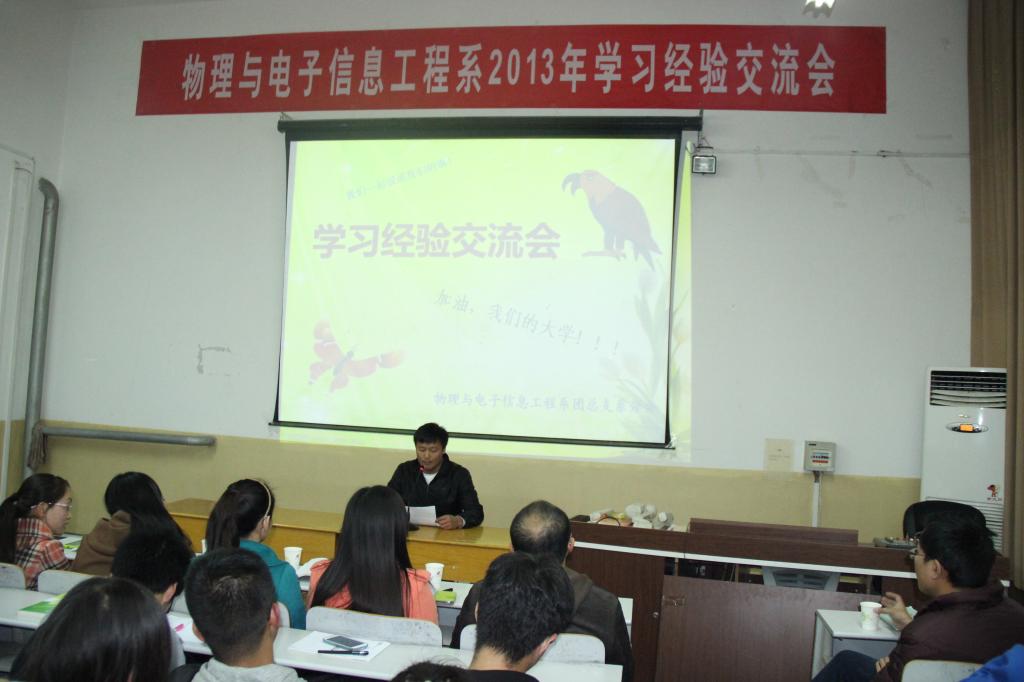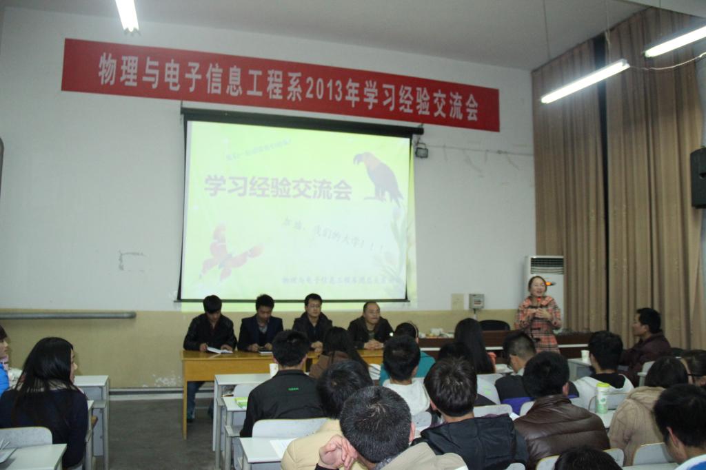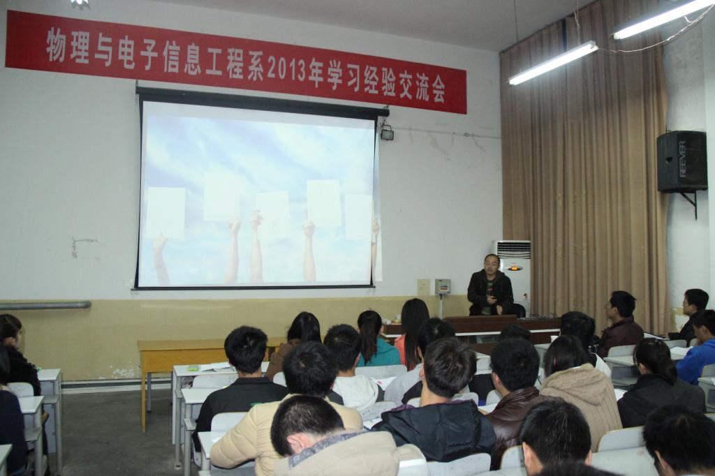 为了使新生更好地融入老员工活,增进新老生之间的交流,加强学风建设,11月20日晚,物理与电子信息工程系于二号教学楼多媒体十七举行了2013年学习经验交流会。