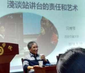 冯博琴教授从上讲台彰显师德、站好讲台的前提和关键、三尺讲台好效果和留口碑等五个方面生动详细地阐述了教师要以站好讲台为天职,把讲台当作教书育人、为人师表的舞台,把孩子们教好,实现老百姓“望子成龙”的愿望。最后冯教授就课堂创新教学、课堂思政教育等方面与师生进行了热烈探讨。