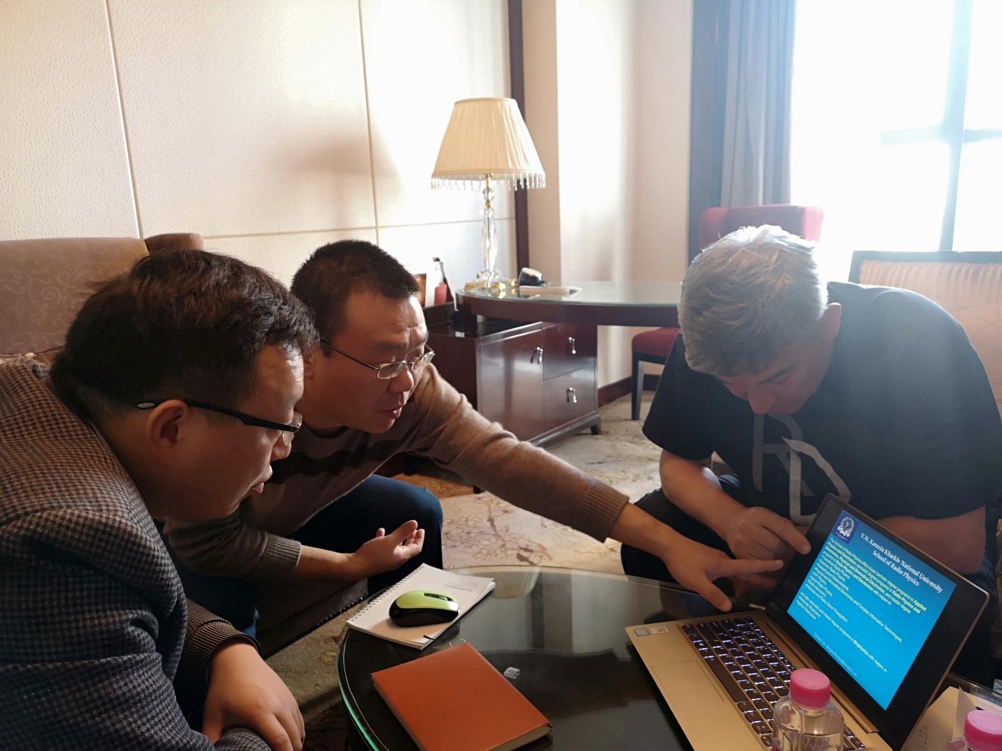10月26日,申博SUNBET经理袁训锋、副经理陈垚及海归博士何适赴河南新乡与参加第一届高校院所河南科技成果博览会的乌克兰哈尔科夫国立大学Sergiy M. Shulga教授进行了亲切会谈。双方在联合申报项目、合作共建实验室、选派员工和教师攻读学位等合作内容的具体细节进行了落实。