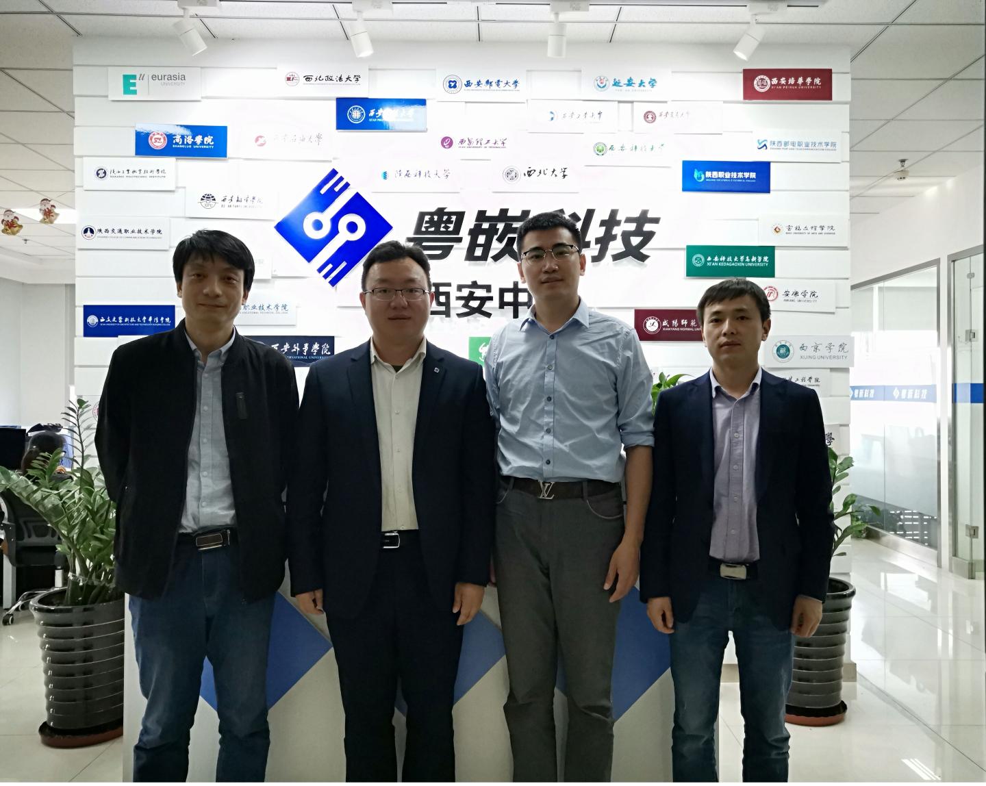 4月30日,申博SUNBET经理袁训锋、副经理陈垚、教师何建强赴西安粤嵌科技公司洽谈校企合作事宜,总经理王乐忠和校企合作总监高博龙热情接待了来访教师。