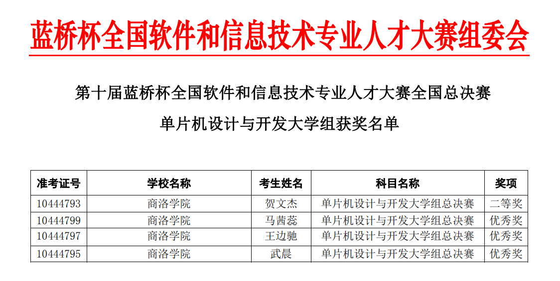 5月25日,第十届“蓝桥杯”全国软件和信息技术专业人才大赛总决赛在北京举行。​公司教师何建强带领贺文杰等4名获得省赛一等奖的员工赴北京首都经济贸易大学考点参加全国总决赛,最终获得单片机开发组国家二等奖1项,优秀奖3项,取得了公司参加该项竞赛以来的最好成绩。