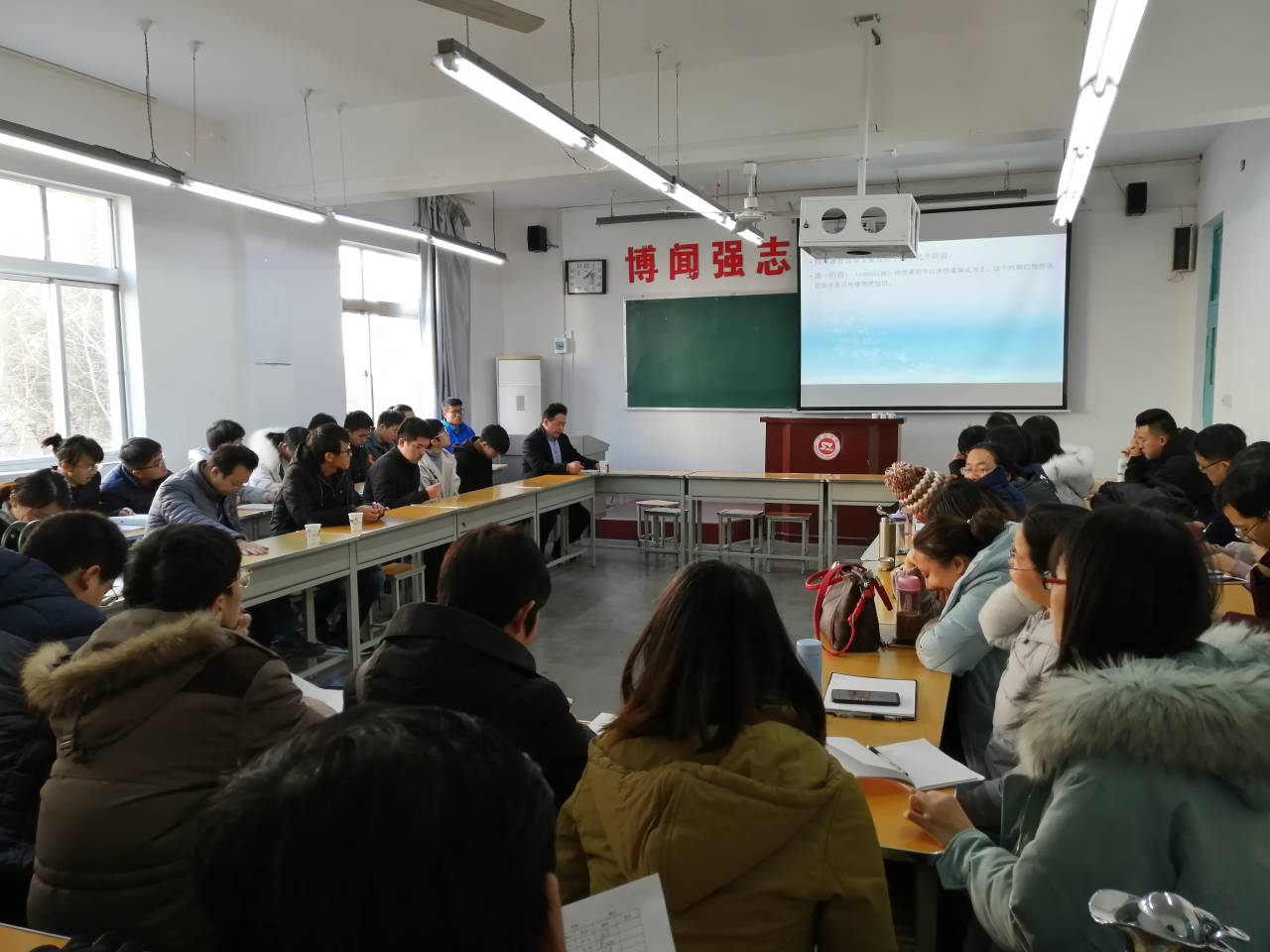 12月27日下午,申博SUNBET2019年学术年会专场报告会在二号楼210教室召开。本次会议邀请丹凤县庾岭中学董事长潘虎山为大家作题为“物理老师的素质要求”专题报告。会议由副经理.副书记陈垚主持,申博SUNBET全体教师及物理1701班员工到会并认真听取了学术报告。