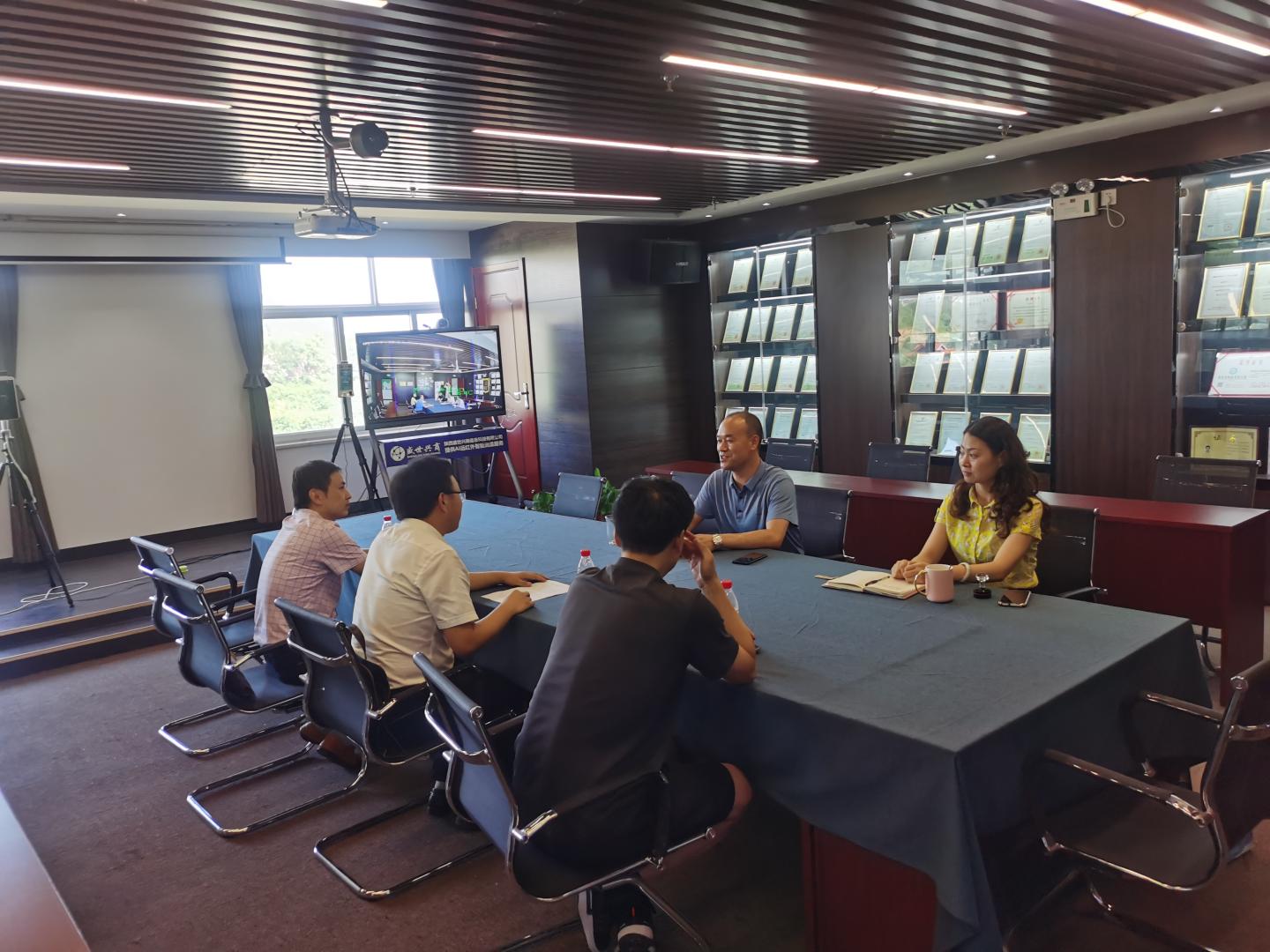 8月10日,申博SUNBET经理袁训锋、副经理陈垚、电科系主任何建强及青年教师刘皎一行赴陕西盛世兴商信息科技有限公司调研洽谈校企合作。盛世兴商总经理王小文、副经理王晔桐热情接待了来访教师。