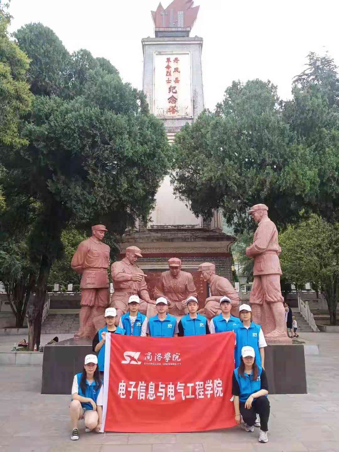 同学们首先来到了丹凤革命烈士陵园。陵园始建于上世纪50年代,巍峨的牌楼大门庄严肃穆,13米高的丹凤县革命烈士纪念塔耸立园中,塔顶雕塑着威武雄壮、持挂冲锋枪的解放军战士,日夜守卫着园内英烈。在陵园西南侧建造的广殿式展览馆,陈列了很多珍贵的革命文物和资料,详实地介绍了革命烈士的丰功伟绩。烈士陵园已被命名为爱国主义教育基地。