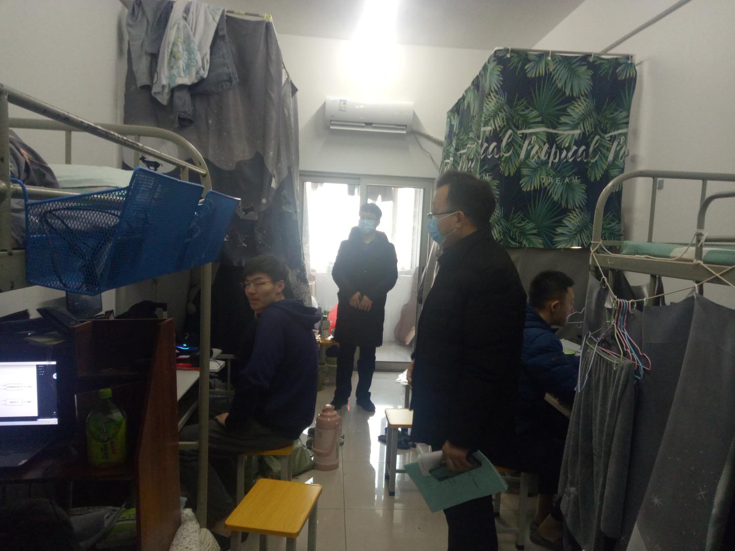 根据课表安排,院领导一行先后查看了丹江校区16A、16B1-2节有课员工宿舍。在员工宿舍,院领导对绝大多数能按时起床、规范上网课的班级同学予以口头表扬和鼓励,对个别还未起床躺被窝“上课”学习的员工予以批评教育。院领导对全体宿舍舍长和班干部强调,一定要切实负起责任,发挥模范带头作用,督促引导全宿舍全班同学做好疫情防控相关工作,严格按照公司要求做好上网课期间的课堂考勤和督查工作,争取做到疫情防控和线上教学“两加强、两不误”。今后公司将定期不定期进行随机检查,对存在问题的员工及班级将予以通报。