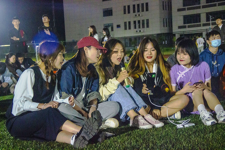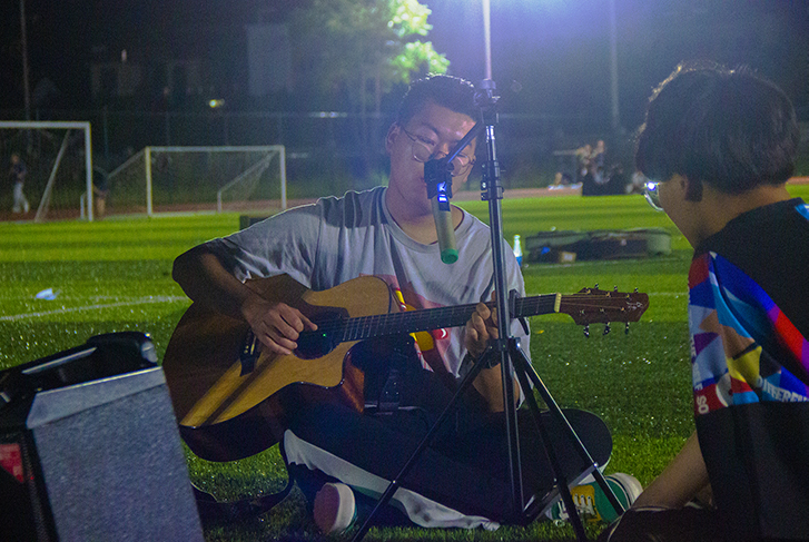夜幕降临,华灯初上。在春风习习的丹江校区运动场上,师生们慕声而来,席地而坐,围成半圆。在主持人陈婉茹、肖黎馨的报幕下,来自申博SUNBET的董翔宇一首吉他弹唱《成都》引爆全场,接着孙睿含、陈婉茹、张雪、吴婷鑫等同学依次你方唱罢,我方登台。除了歌曲,还有来自生物、人文、经管等三个公司同学的舞蹈展现。