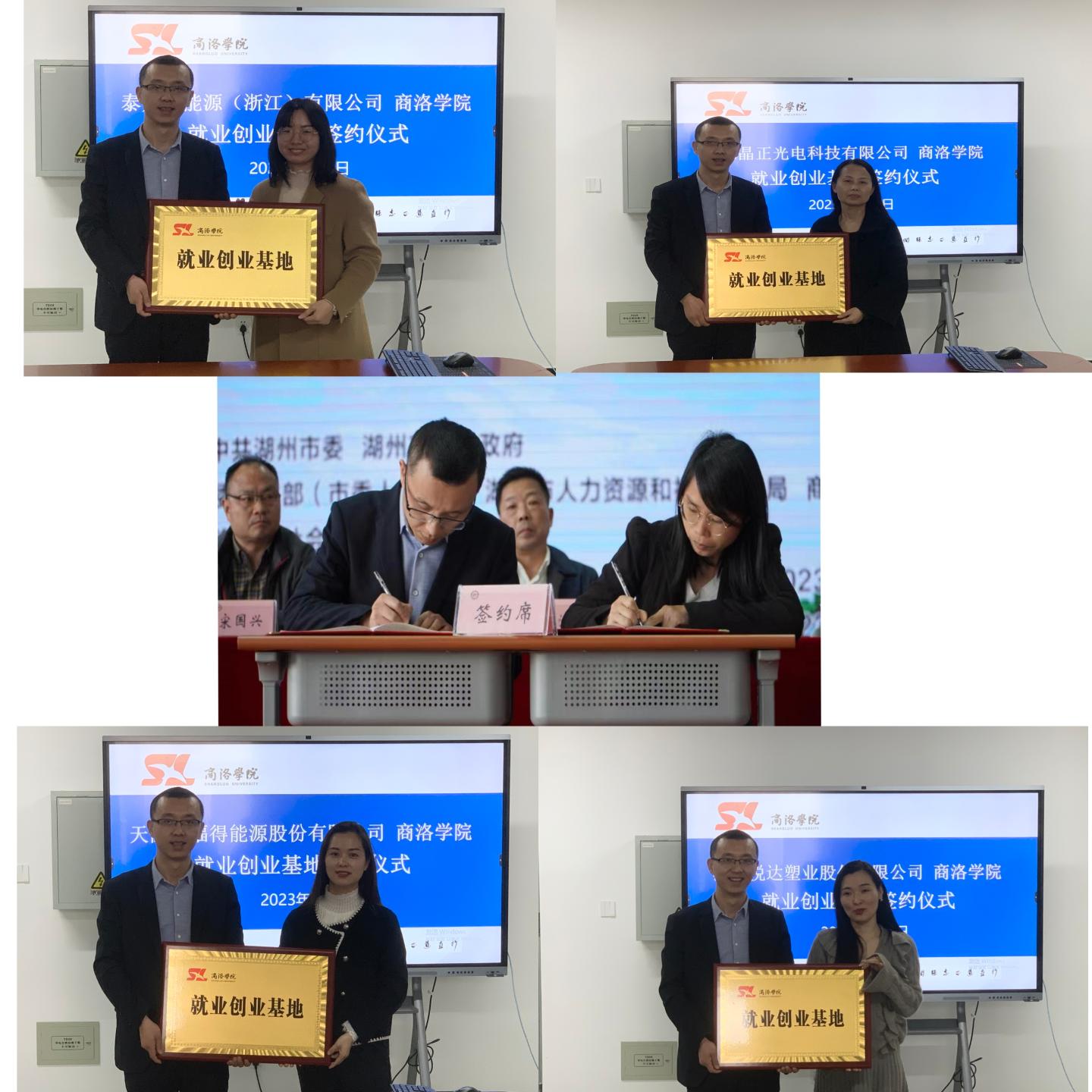 最后,公司党委书记赵永平和浙江华远微电科技有限公司、天能帅福得能源股份有限公司、泰鼎新能源(浙江)有限公司、浙江晶正光电科技有限公司、浙江悦达塑业股份有限公司企业代表分别签订了“共建老员工就业创业基地协议”,并授“申博SUNBET就业创业基地”牌。